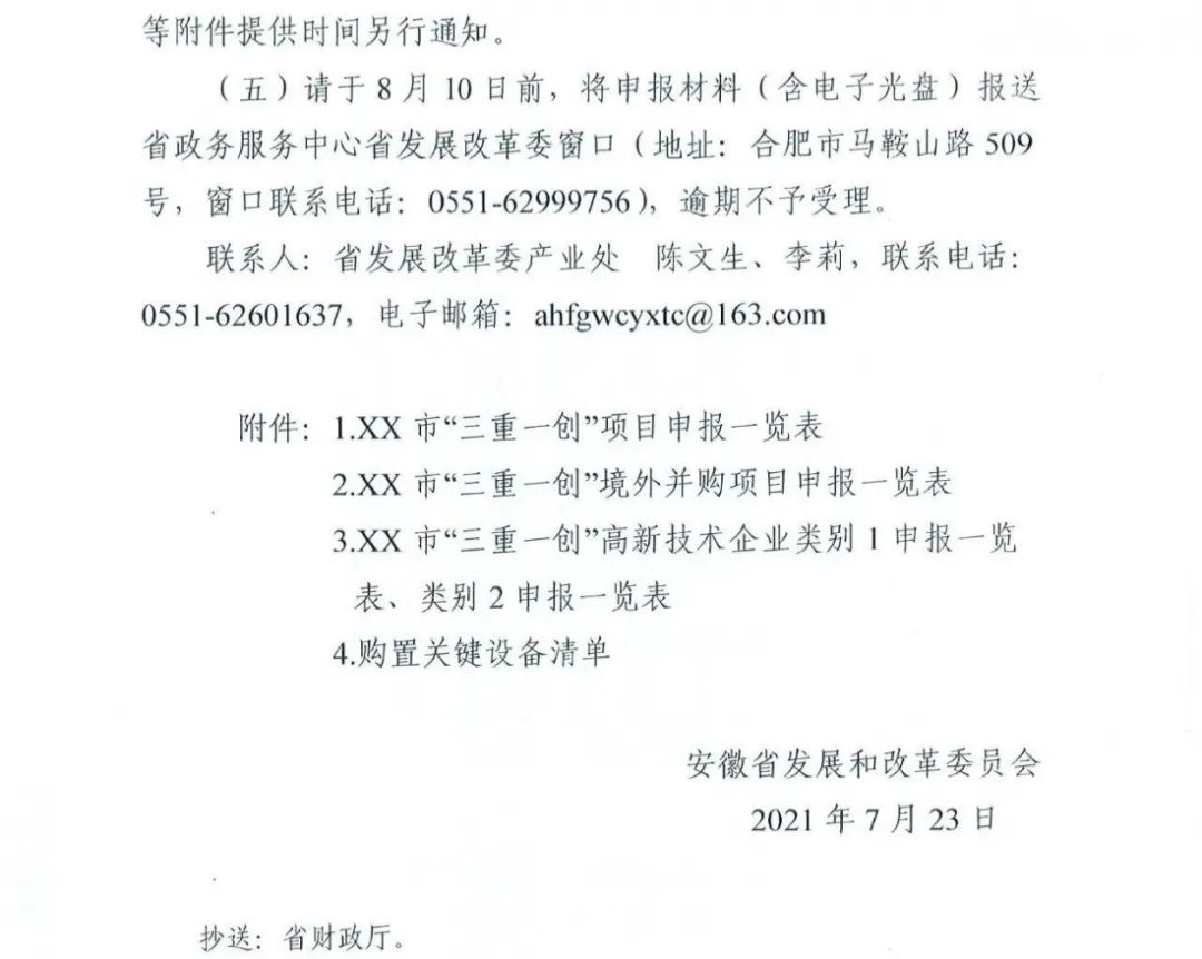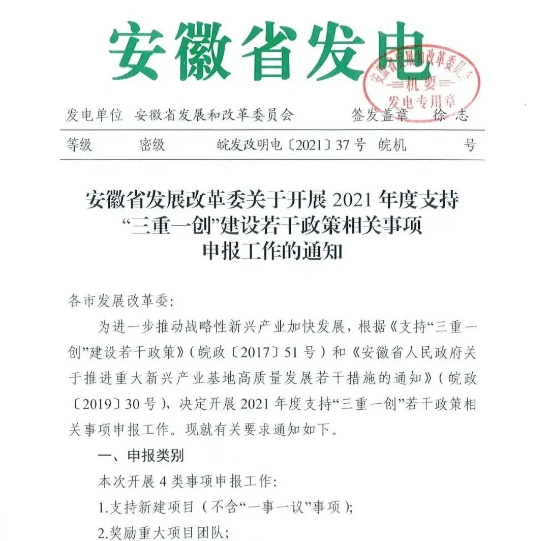 安徽省發(fā)展改革委關(guān)于開(kāi)展2021年度支持“三重一創(chuàng)”建設(shè)若干政策相關(guān)事項(xiàng)申報(bào)工作的通知