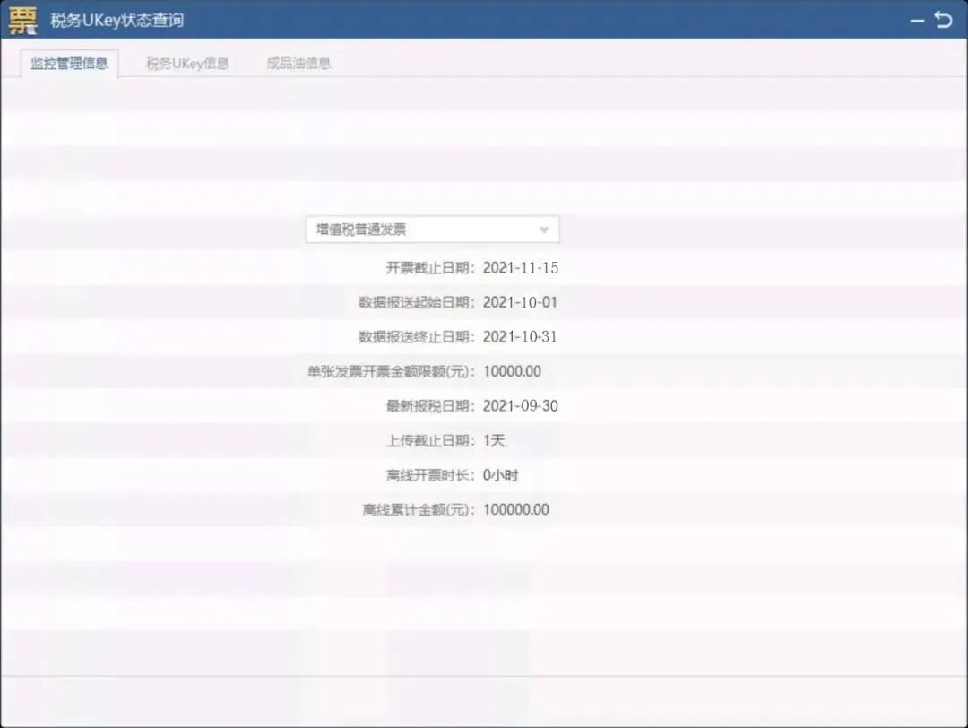 系統(tǒng)設(shè)置-稅務(wù)UKey設(shè)置-稅務(wù)UKey狀態(tài)信息,彈出“稅務(wù)UKey狀態(tài)查詢”窗口,系統(tǒng)默認顯示在監(jiān)控管理信息選項卡,查看各發(fā)票種類“開票截止時間”更新至2021年11月說明反寫成功。