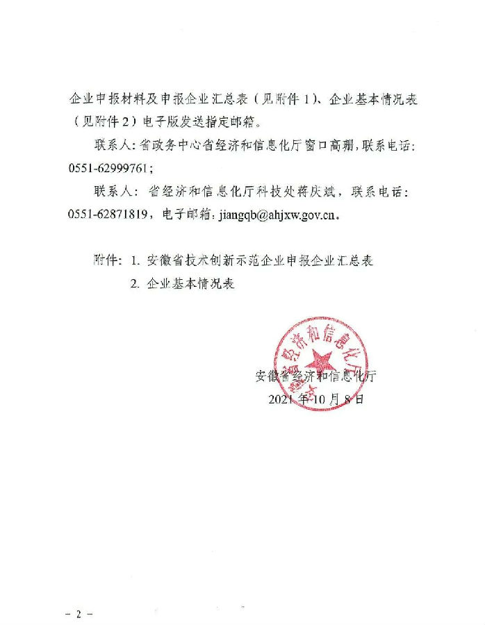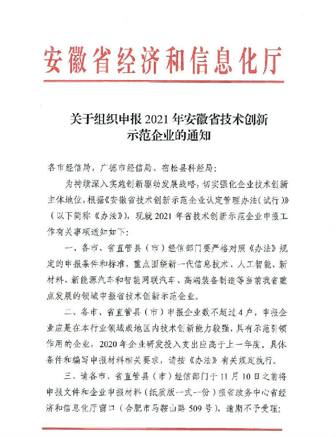 關(guān)于組織申報2021年安徽省技術(shù)創(chuàng)新示范企業(yè)的通知